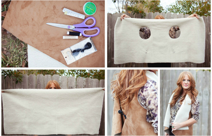 Все что нужно для создания этого стильного жилета — это прямоугольный кусок дубляжа и фурнитура. С помощью ножниц, сделайте аккуратные разрезы для рук, сзади пришейте купленную фурнитуру и наслаждайтесь уютной и уникальной вещицей, сделанной собственными руками.