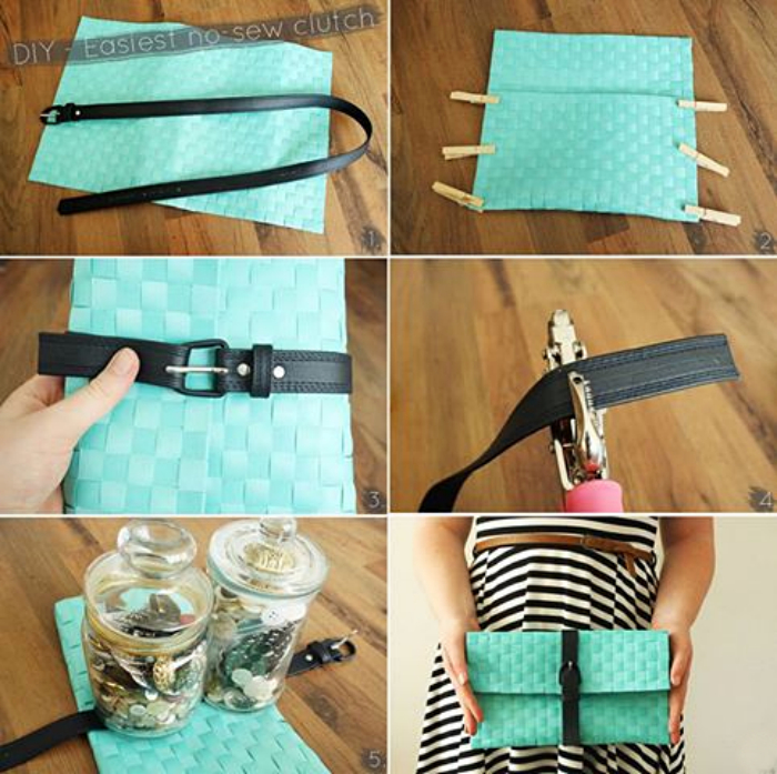 Яркий и стильный клатч, который можно сделать из куска поливинилхлорида, чаще всего используемого для изготовления салфеток для сервировки стола, хорошего клея и тонкого черного ремня.