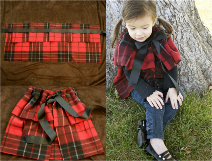 Стильная детская накидка, которую можно легко смастерить своими руками из двух небольших кусков флиса и атласной ленты. Нужно просто сложить два вместе два кусочка ткани, проделать в них отверстия и пустить через них ленту. Края ткани можно обработать на швейной машинке или за неимением навыков с помощью клейкой ленты для ткани.