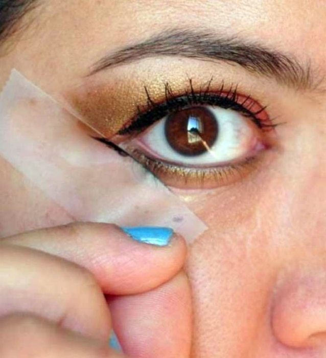 Воспользуйтесь обычным скотчем, чтобы создать четкую границу теней и нарисовать идеальные стрелки. Небольшая полоска скотча, приклеенная под нужным углом, у внешнего уголка глаза позволит сделать симметричный макияж и существенно сэкономит время.