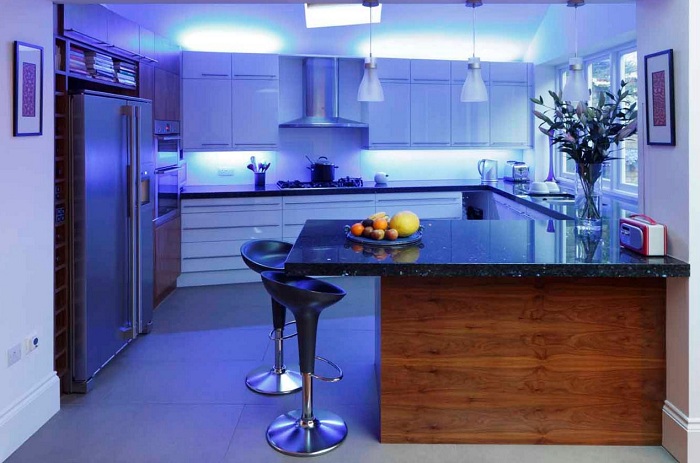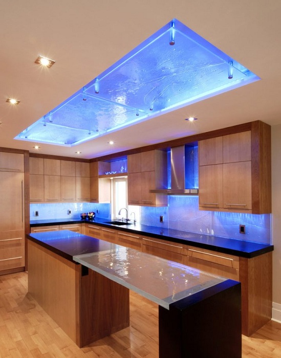Современный интерьер кухни преображен с помощью голубой контрастной подсветки.