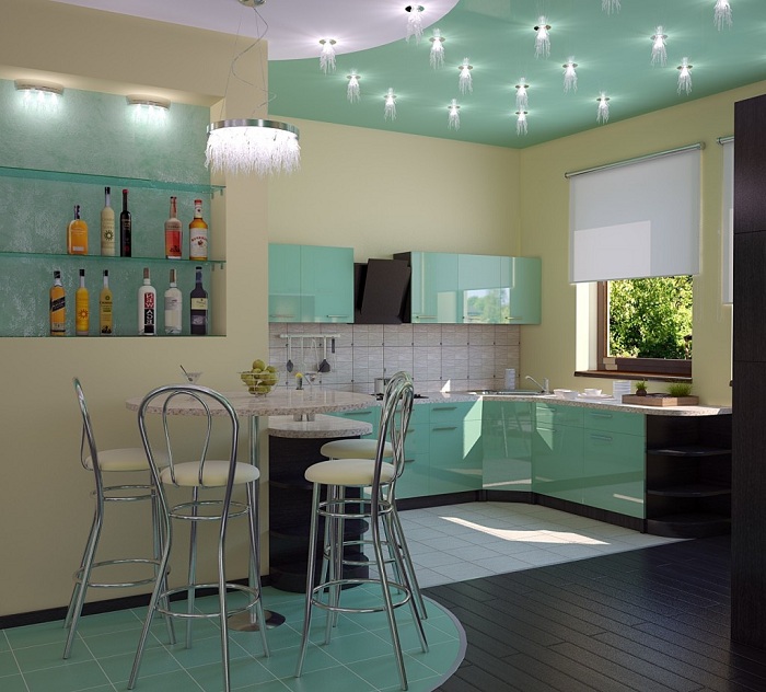 Украшение потолка кухни множеством лампочек — отличное решение.
