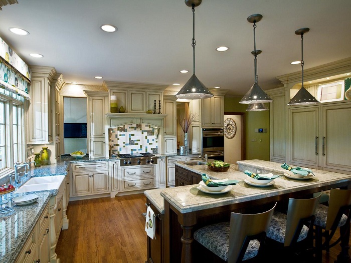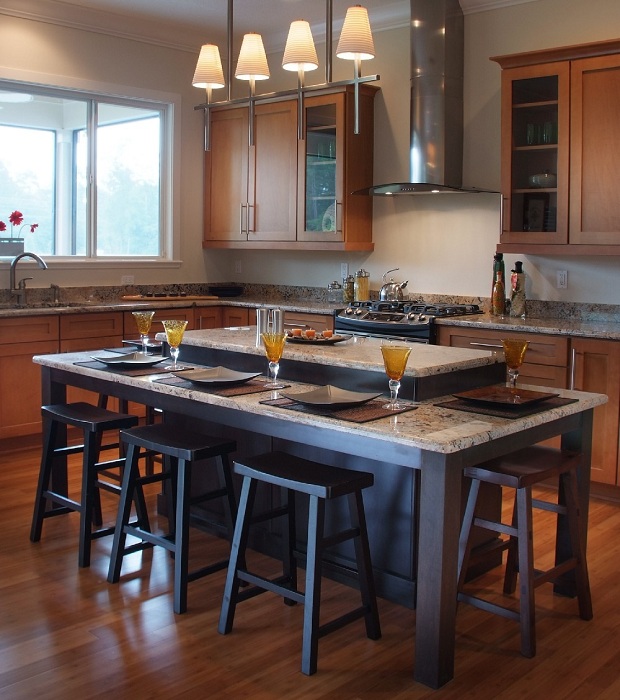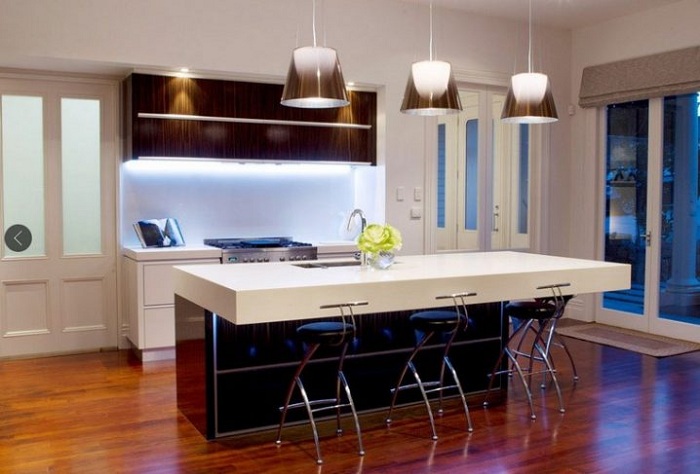 Отличное решение украсить кухню с помощью оригинальных люстр.