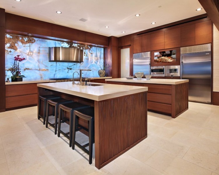 Яркий современный интерьер кухни благоустроен с помощью красивой подсветки.