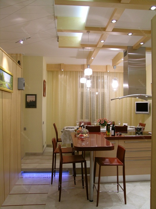 Оригинальный интерьер кухни преображен с помощью освещения.