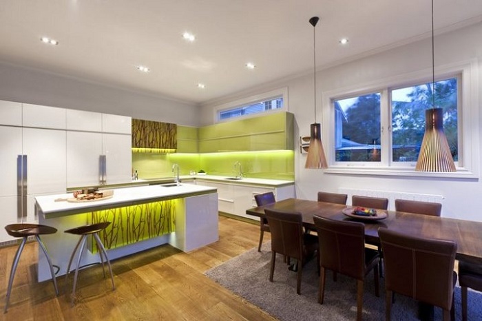 Отличный интерьер кухни с ярко-салатовой подсветкой.