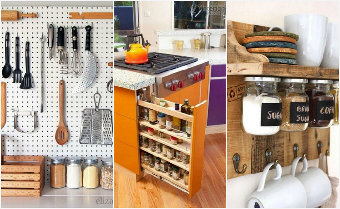 Эта идея не новая, но всегда работающая, причём на кухнях с разной площадью. Рейлинги, металлические корзинки, настенные держатели, магнитные ленты – все эти инструменты способны сделать вашу кухню более удобной.
