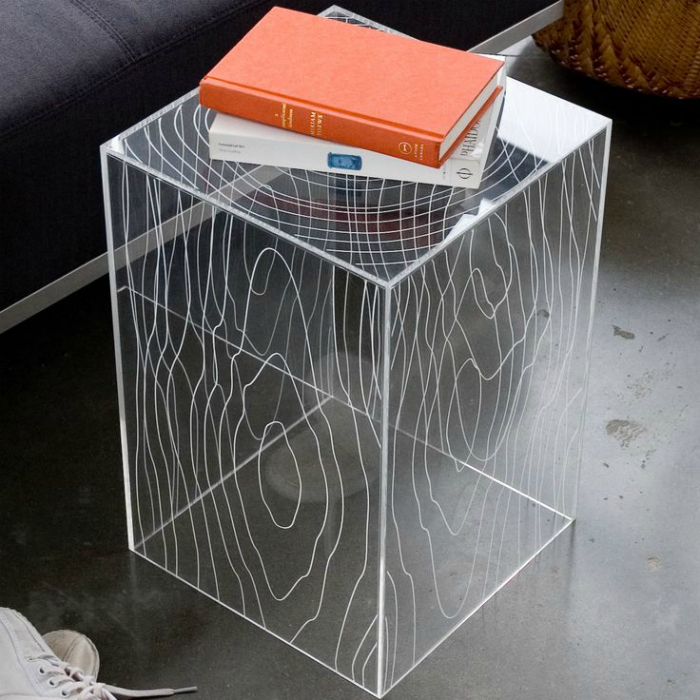 Небольшая ультрасовременная прикроватная тумбочка, сделанная из прозрачного акрила, станет неповторимым аксессуаром любой спальни.