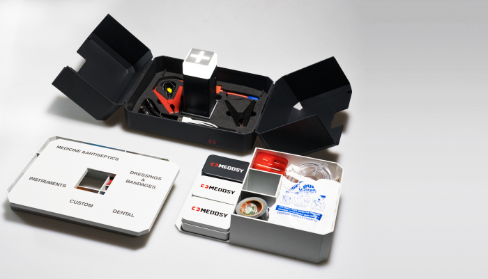 Любопытнейшим элементом Meddsy стало то, что внутри аптечки не только медицинские принадлежности. Там есть аккумулятор с набором разнообразных насадок для провода. Есть контакты для «оживления» аккумулятора автомобиля, есть средства зарядки мобильных устройств. В набор также входит нож, универсальный карманный набор инструментов и фонарик.