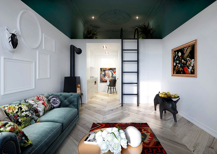Интерьер, изображённый на фото, ограничен 30-ю квадратными метрами. Крошечная квартира находится в Польше. Чтобы визуально расширить её границы, дизайнеры выбрали белый в качестве основного цвета для оформления стен, а вот потолок окрасили в глубокий изумрудный оттенок. Как известно, оттенки синего и зелёного способны дарить пространству перспективу.