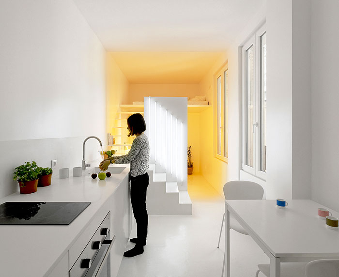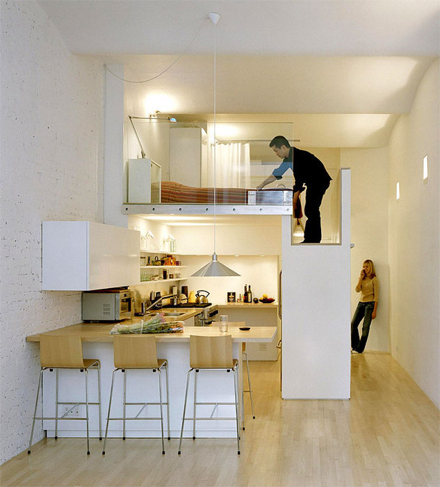 Когда квартира совсем крошечная, а потолки высокие задействуйте их по максимуму. Кровать поднимите на второй уровень, а на первом организуйте функциональную зону, например, кухню, гостиную, рабочий кабинет или гардеробную.