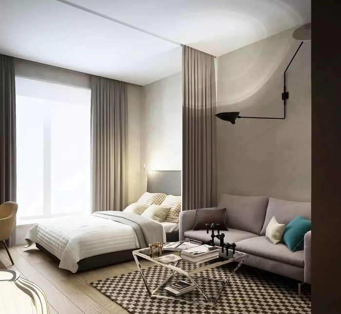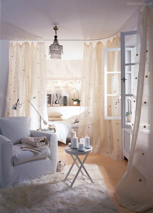 Вот где остро стоит вопрос зонирования пространства, так это в однушках и квартирах студиях. Тут часто возникает необходимость отделить спальное место от остальной части, сделать его как можно более уютным и интимным. Без шторы тут точно не обойтись! Ею можно отделить сразу часть комнаты, установив на металлическую штангу. Или же придумать оригинальные решения, например, окаймить шторой лишь спальное место, если в квартире немного свободного места.