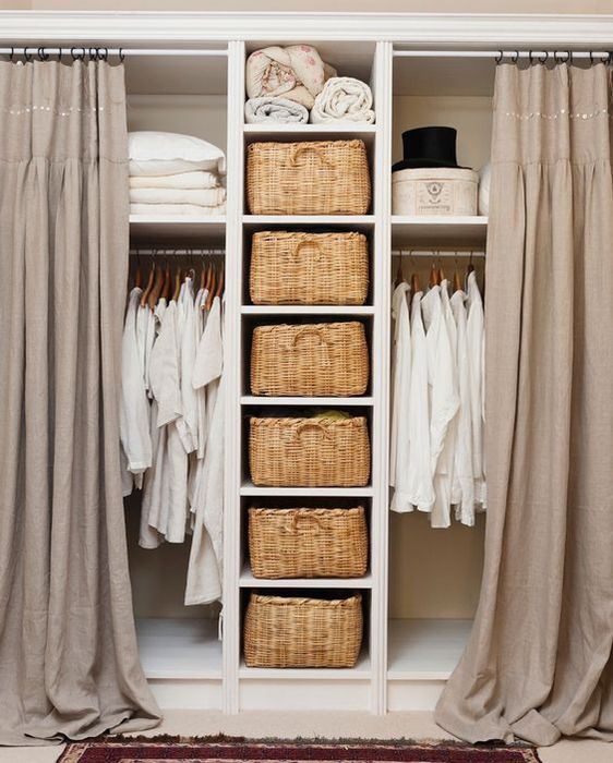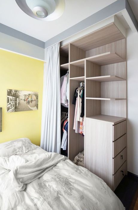 Не всегда в маленькой квартире или спальне есть возможность поставить большой платяной шкаф для хранения вещей. В этом случае владельцы малогабариток прибегают к помощи открытых гардеробов. На них также помещается немало вещей, они мобильны и лаконичны, но далеко не всем нравится ежедневно смотреть на свои вещи. Поэтому спрятать их с глаз долой также можно при помощи штор.
